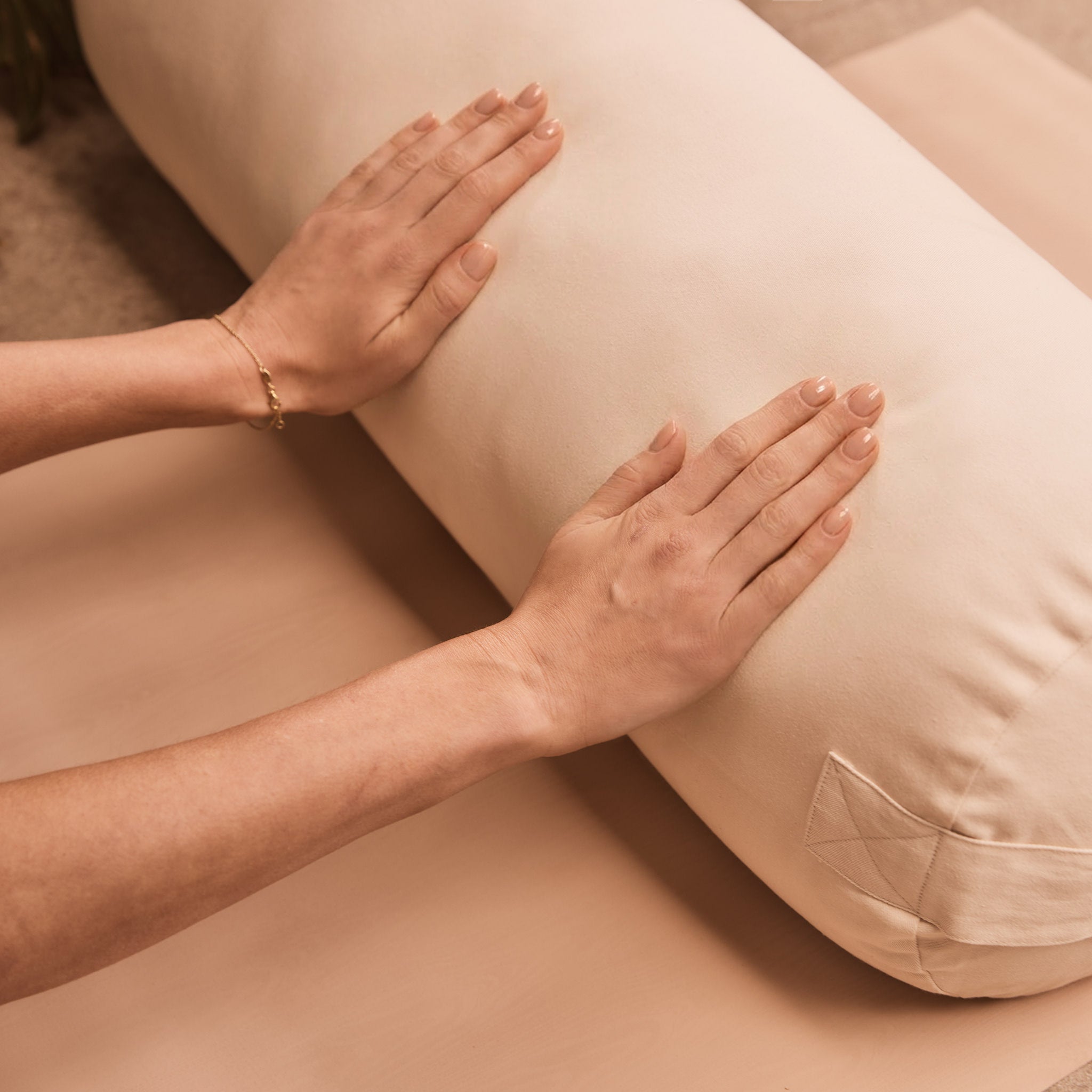 Inside, dense cotton is packed to create a reassuring weight and a consistent response from end to end. The cylinder keeps its height without hard spots or hollows, so the spine, hips or knees feel clearly supported rather than drifting or sinking. The result is a grounded, stable base that invites the rest of the body to soften.