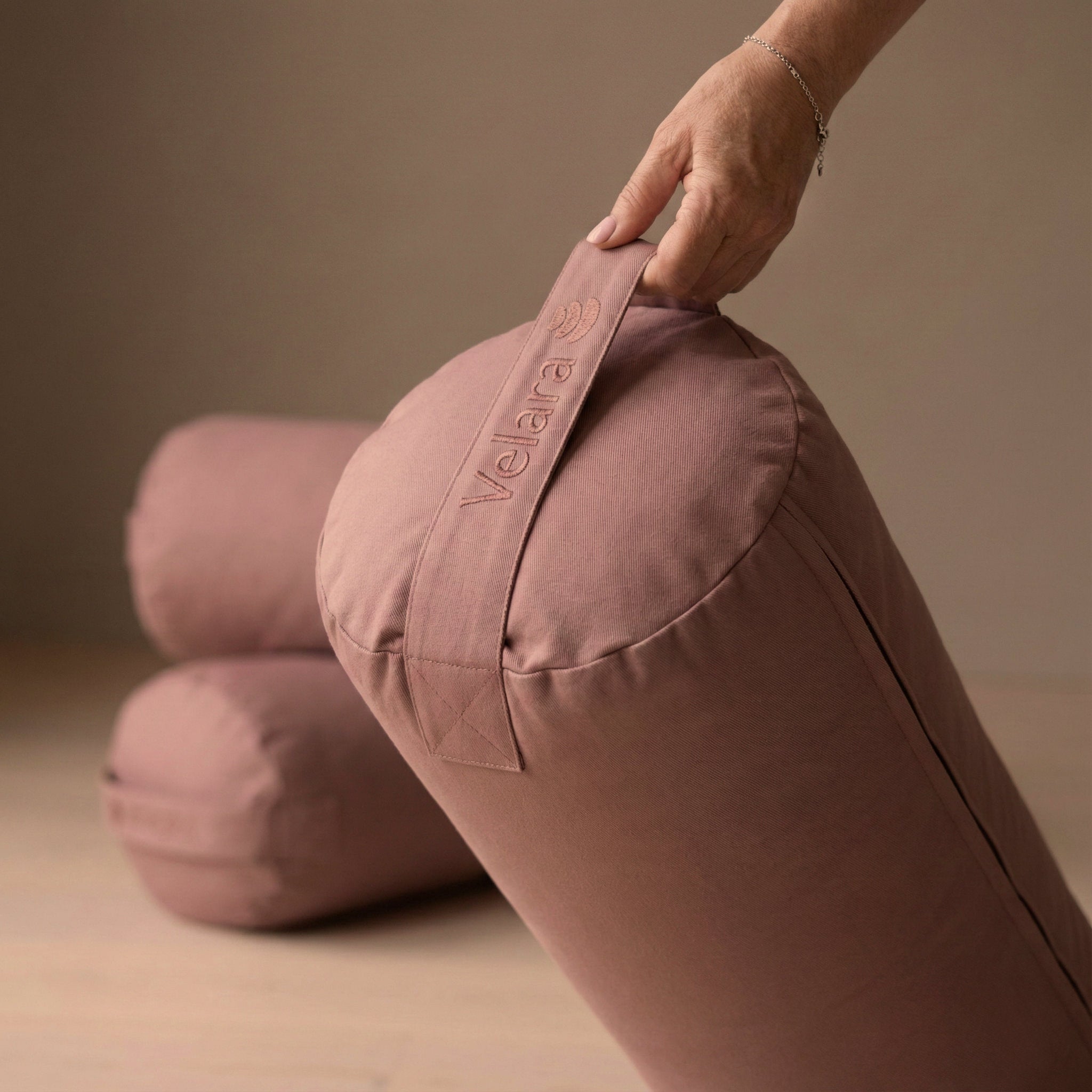 Neat, reinforced seams and a discreet handle are designed for frequent lifting, stacking and adjusting. The bolster feels solid in the hand and maintains a clean outline over time, even in studios where it is used every day.